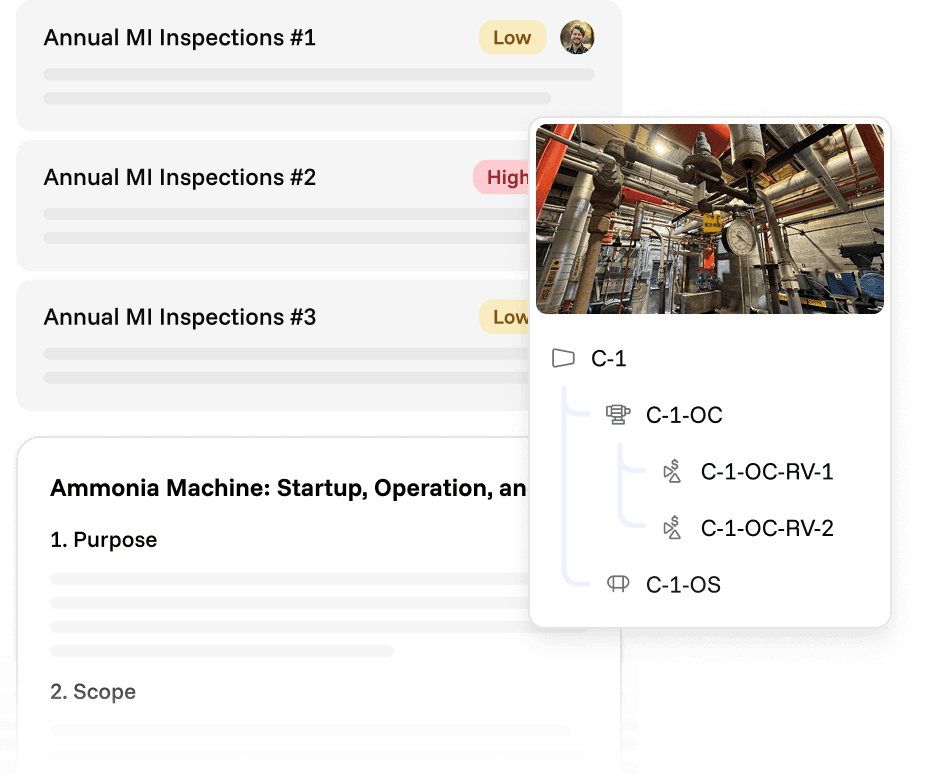 Every recommendation, activity, document, and piece of equipment—searchable, linked, and always current. Click on a compressor and see every connected SOP, inspection, equipment drawing, IOM, and recommendation.