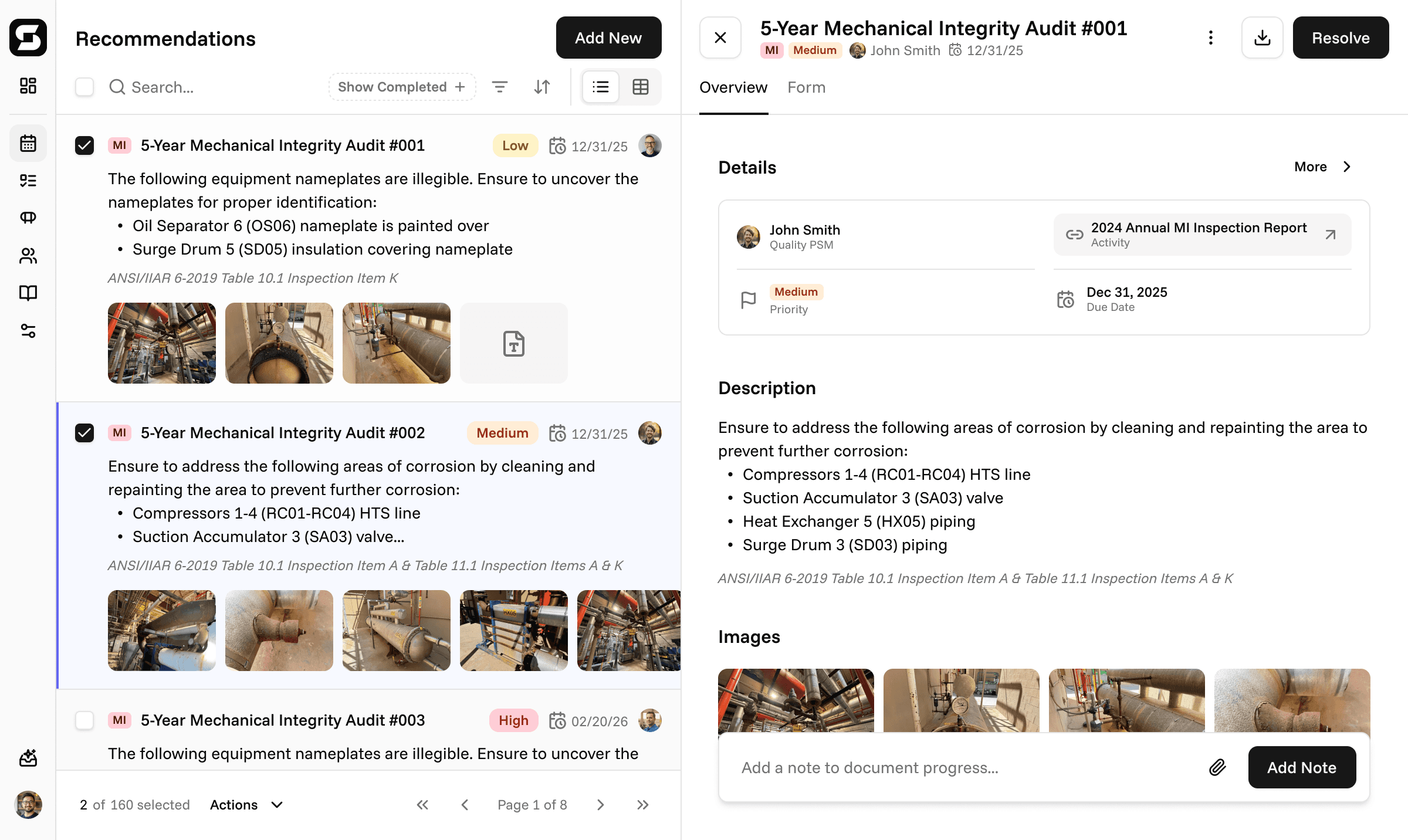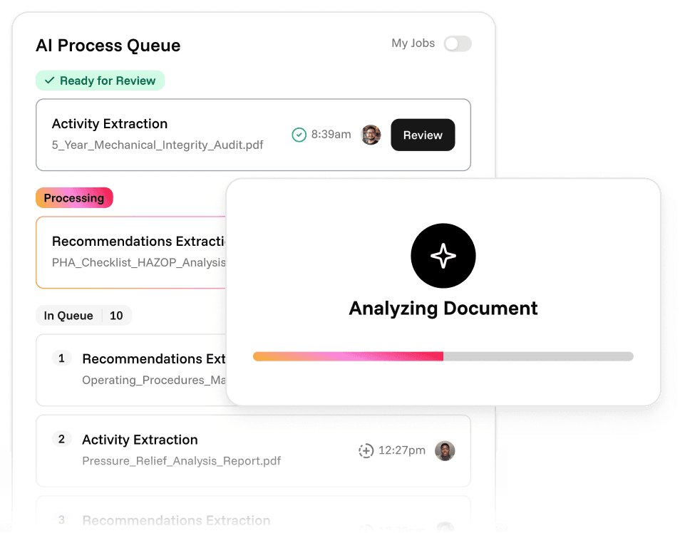 Upload any type of inspection, PHA, or audit document. AI extracts every recommendation with references, priority level, due dates, and more into your system automatically.